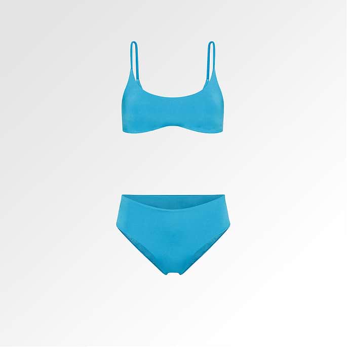 طقم سباحة مؤلف من قطعتين مصنوع من خيط ECONYL® المعاد تدويره، ومصمّم لأيام الشاطئ النشطة. ناعم على البشرة، ويوفّر الدعم والمرونة مما يجعله مثاليًا للحركة. لونه الفيروزي الحيوي يضيف لمسة لافتة وأنيقة.